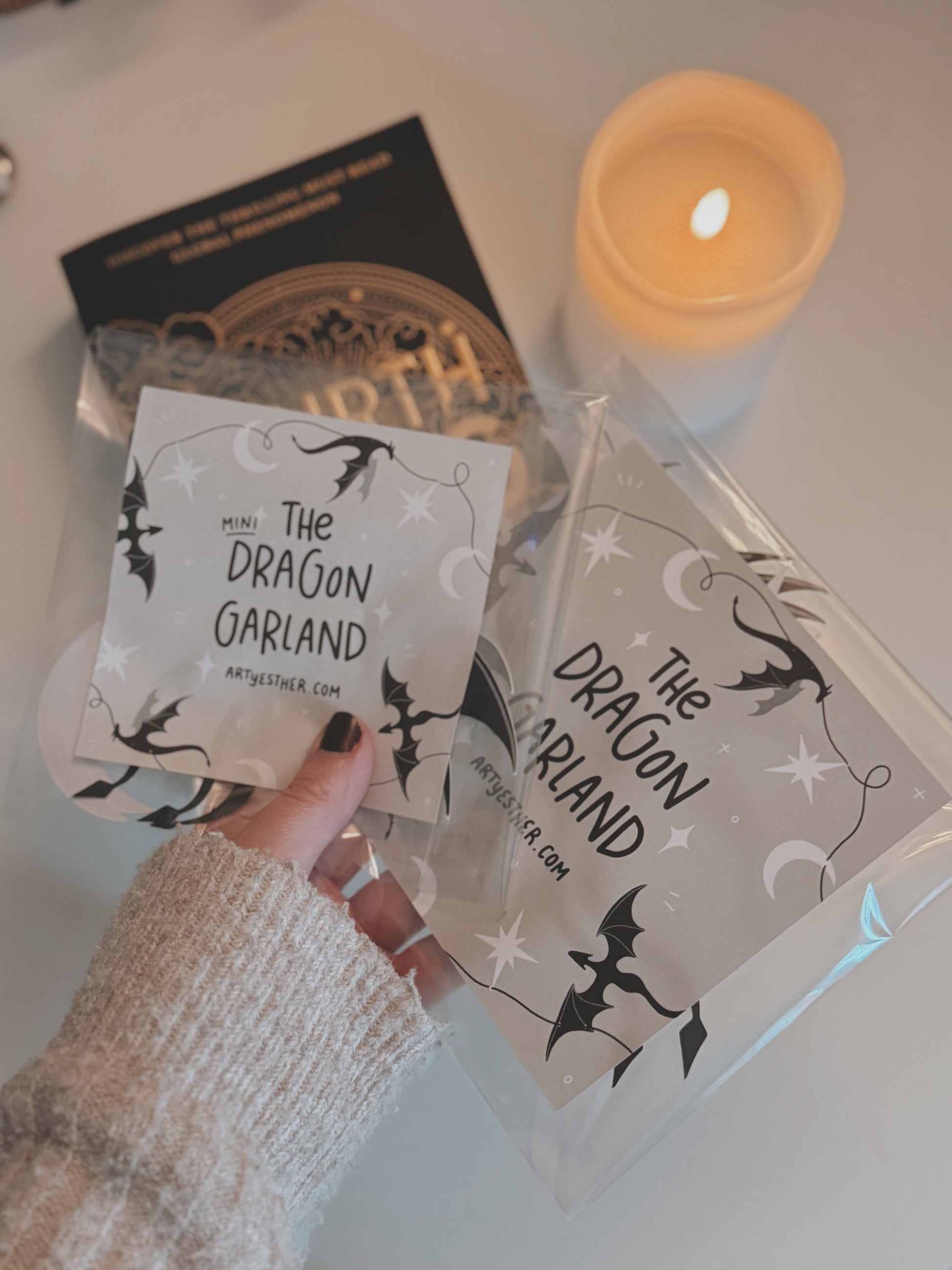 The mini Dragon Garland - approx. 60cm in length. The cardstock shapes are smaller in size. Contains x3 dragons, x 2 crescent moons and x2 stars. Suitable for bookshelves, desk decor, or even in your car!